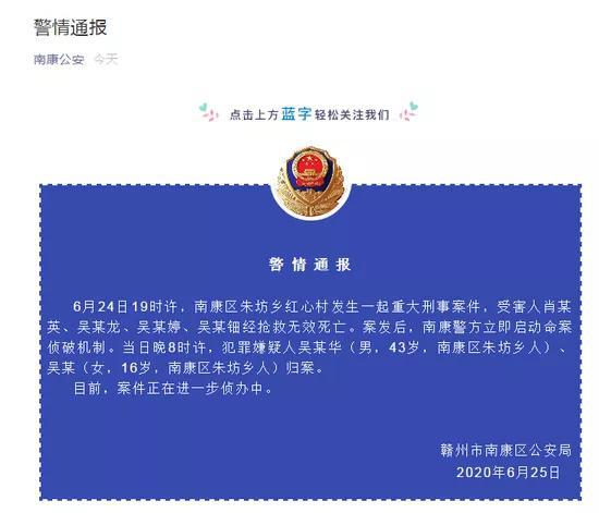 6月24日19时许,南康区朱坊乡红心村发生一起重大刑事案件,受害人肖某英、吴某龙、吴某婷、吴某钿经抢救无效死亡。案发后,南康警方立即启动命案侦破机制。当日晚8时许,犯罪嫌疑人吴某华(男,43岁,南康区朱坊乡人)、吴某(女,16岁,南康区朱坊乡人)归案。