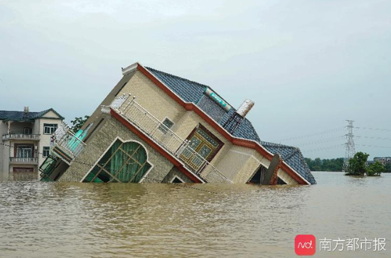 南都记者了解到,受洪水影响,7月8日,鄱阳县油墩街镇一处决口处有5栋相连的房屋被洪水冲垮,其中4栋完全浸没在水中,1栋倾倒在水中,目前还露出房屋一角。洪水侵袭之下,有房屋在数秒内就被冲毁吞噬。冲垮前,楼内人员均已提前转移到安全地带。