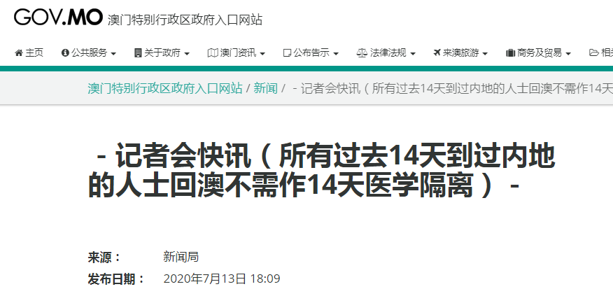 澳门政府网站:今天起,内地所有城市居民到访澳门无需14天隔离