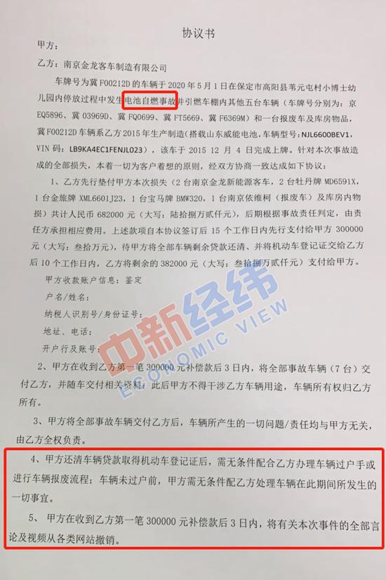 中新经纬记者注意到,上述协议书中,南京金龙使用了“垫付”赔偿的说法。张洁说,南京金龙以两家公司曾签过车辆外包售后服务责任承诺书为由,让张洁去找山东威能索赔。