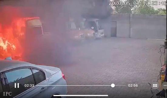 监控录像显示,客车自燃后火势迅速蔓延,引燃了停放在旁的6辆车,分别为5辆客车、1辆宝马牌轿车。火扑灭后,这7辆车全部被烧得只剩下残骸。