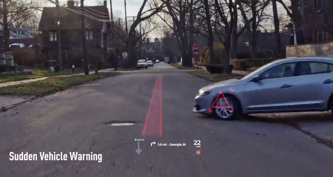 而松下最新开发的AR抬头显示系统引入先进的光学技术,能够进一步拓展驾驶员的视野。同时在AI的加持下,该系统还能自动识别车辆周围环境,提供彩色3D导航图形。从介绍视频我们可以看到,该系统除了能显示行车线标记和GPS箭头外,还能识别前方障碍物、侧方来车、行人/自行车、停车位、桥底限高等。