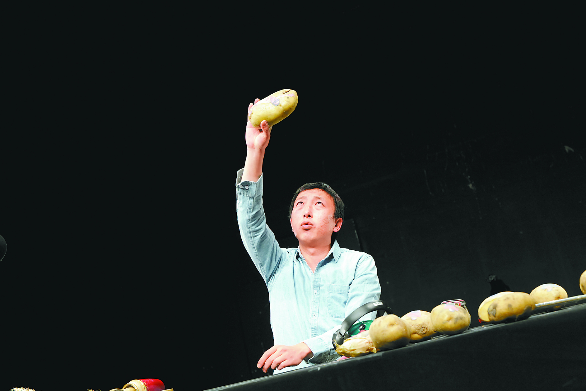 五是李建军导演的《带电的火花》。作为“青戏节”线上单元的直播剧目之一,李建军和他的新青年剧团,延续了近年来对素人演剧的探索,此次作品是为其合作多年的素人演员马建东量身打造的独角戏。作品基于对马建东乡土成长与家庭生活的采访,以个人口述史为叙事框架。演出中,由马建东对着镜头表演,以桌子上的土豆、玉米、番茄等农作物为道具,一边讲述自己的家族故事,一边以拟人的手法,配合纪录影像、动画元素,为观众搭建起视觉想象的画面。素人演剧、纪录剧场是近年来外国戏剧影响下在本土催生的重要类型,新青年剧团的多年实践,可谓找到了其在国内生根的土壤及这类作品可能传递的本土社会学意义。