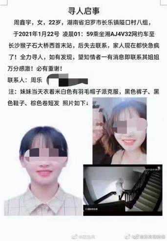 此前据家属发布的寻人启事显示,女孩名叫周鑫宇,今年22岁,是湖南省汨罗市长乐镇隘口村八组人。1月22日凌晨1点59乘坐网约车至长沙猴子石大桥西首末站,后失去联系。据寻人启事显示,女孩为棕色卷短发,失联当天身穿有羽毛帽的米白色派克服、黑色裤子及黑色鞋子。“家人现在都快急疯了!全力寻人。如有发现,望知情者一有消息即联系其姐姐。万分感谢!必有重谢!”寻人启事称。