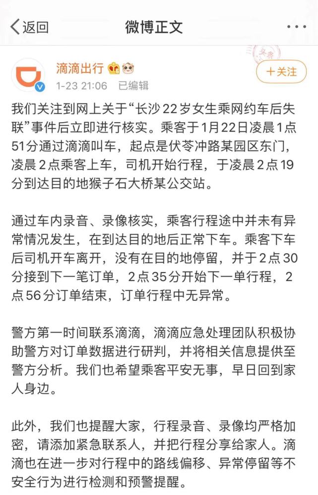 1月22日,有网友发帖称,“长沙一22岁女生乘坐网约车后失联”。23日,北青-北京头条记者致电长沙公安,警方称正在调查中。女孩一朋友告诉北青-北京头条记者,女孩失联后,网约车司机配合了警方调查,女孩系网约车行程结束后失去行踪。23日晚,滴滴发消息称,通过车内录音、录像核实,乘客行程途中并未有异常情况发生,乘客下车后司机开车离开。