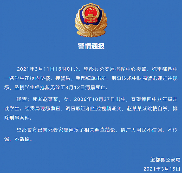 据望都县公安局微信公众号消息,2021年3月11日16时01分,望都县公安局指挥中心接警,称望都四中一名学生在校内坠楼。接警后,望都镇派出所、刑事技术中队民警迅速赶往现场,坠楼学生经抢救无效于3月12日清晨死亡。