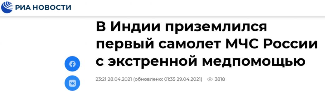 该消息来源于俄新社的一名记者。据称,由俄罗斯紧急情况部提供紧急医疗援助的两架飞机中的第一架已降落在新德里。