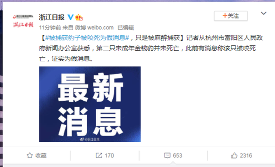浙江日报报道,记者从杭州市富阳区人民政府新闻办公室获悉,第二只未成年金钱豹并未死亡,此前有消息称该只被咬死亡,证实为假消息。