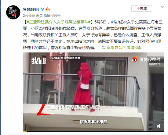 5月6日,41岁红衣女子史某某在海南三亚一小区25楼阳台外跳舞坠楼。有网友分析称,跳舞坠楼的场面存在多个异常情况,当地政法委相关工作人员称,女子行为有异常,已经介入调查。工作人员强调,调查方向还不确定,在未出结论之前,请网友不要信谣传谣。针对网传打印版遗书的真假,警方称调查中暂无法透露。