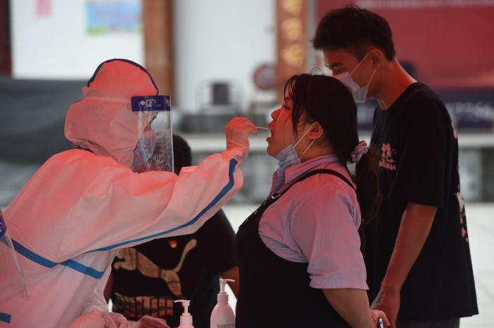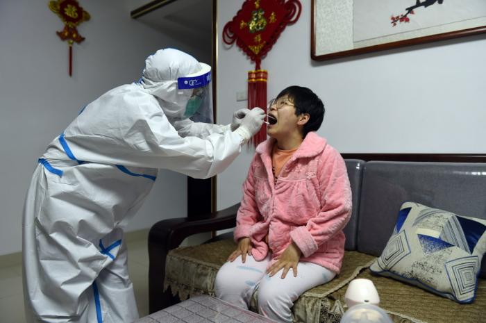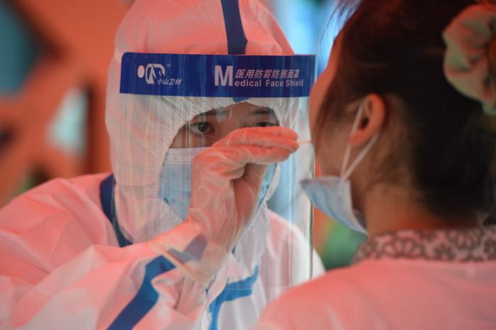 5月15日,在六安市裕安区和顺社区,医护人员为居民做核酸检测。自5月14日起,安徽省六安市启动新冠肺炎疫情控制应急预案,迅速对主城区开展全员核酸检测。