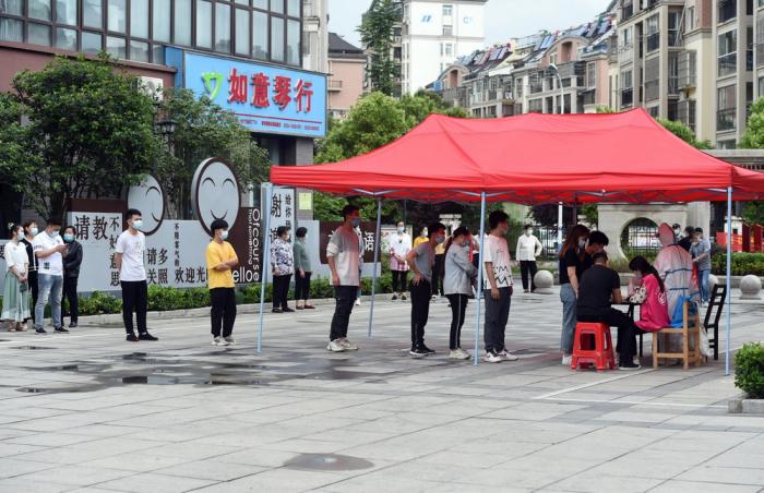 5月15日,在六安市裕安区和顺社区,居民排队接受核酸检测。