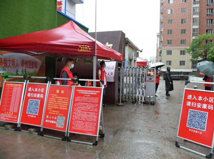5月15日,工作人员在六安市裕安区百川明庭小区门口值守。