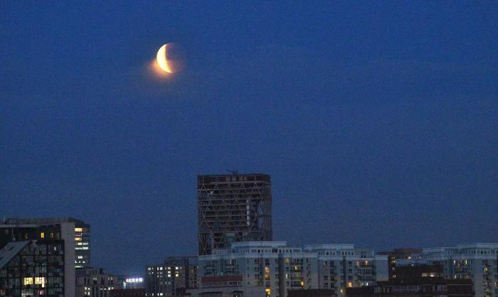 5月26日,20:19在北京朝阳区拍摄的月食。本次月全食初亏开始于17时45分。