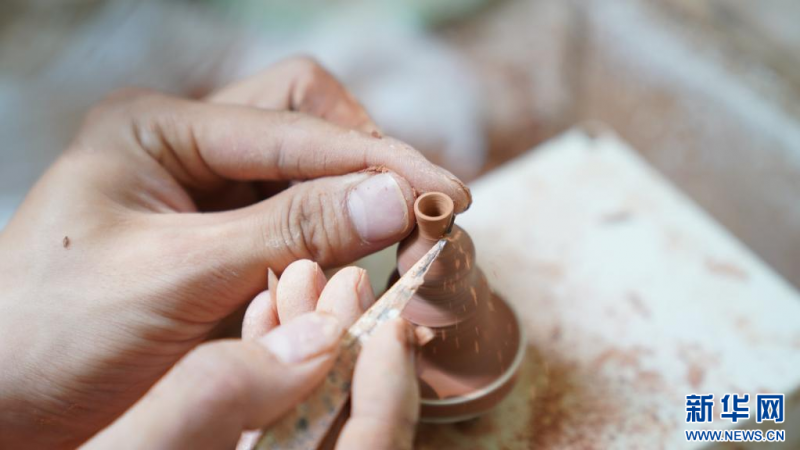 7月15日,陈帅在工作室进行拉胚工序(新华社记者 胡晨欢 摄)