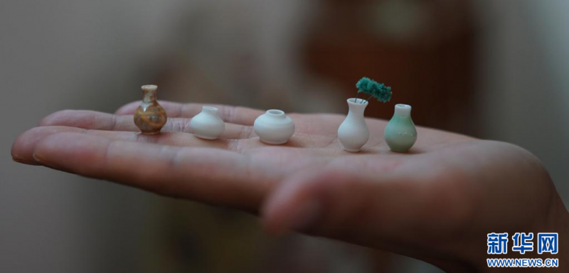 7月15日,陈帅在工作室展示近期创作的部分袖珍瓷作品(新华社记者 胡晨欢 摄)