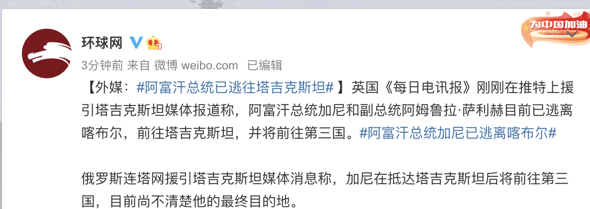 外媒:阿富汗总统已逃往塔吉克斯坦