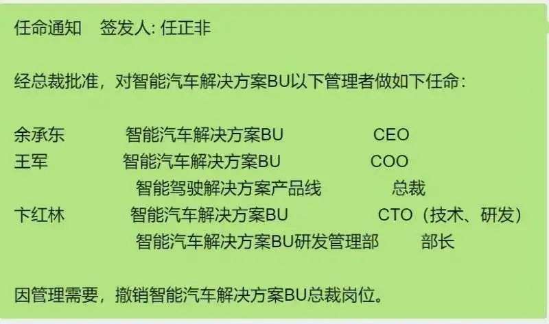 今年5月,余承东担任新增的智能汽车解决方案BU CEO;7月,原华为消费者BG首席技术官卞红林担任CTO;9月2日,任正非亲自签署关于华为智能汽车解决方案BU的人事任命,IAS BU内部迎来研发、销售、产品规划等多项职能的整合。
