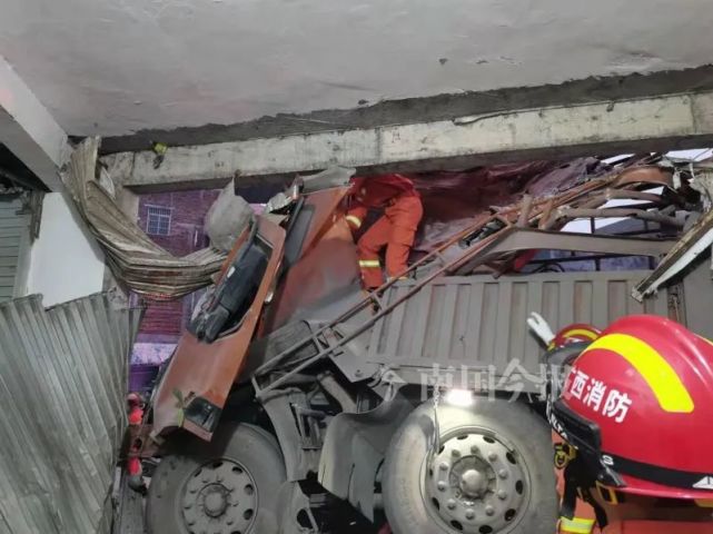 来宾大货车撞进民房,消防紧急救援,司机遗憾未能挽回