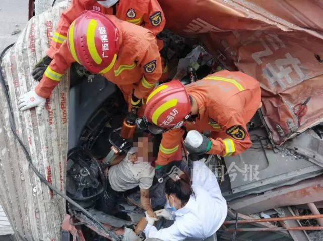 据了解,事故发生时,大货车上仅有司机1人。消防员赶到时,他仍然被困在严重变形的驾驶室里,血流满面,意识已经模糊不清,在消防人员的呼唤下,司机只能以微弱的呻吟作为回应。