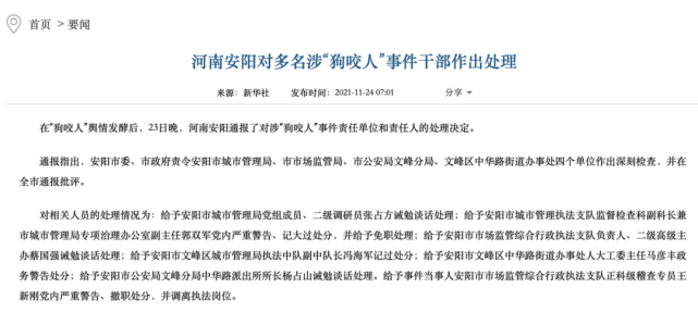 就在11月23日晚,涉“狗咬人”事件责任单位和责任人的处理决定对外公布。其中,事件当事人王新刚被给予党内严重警告、撤职处分,并调离执法岗位。安阳市城市管理局已对涉事犬只进行收容,并注销了涉事犬只的《养犬登记证》。