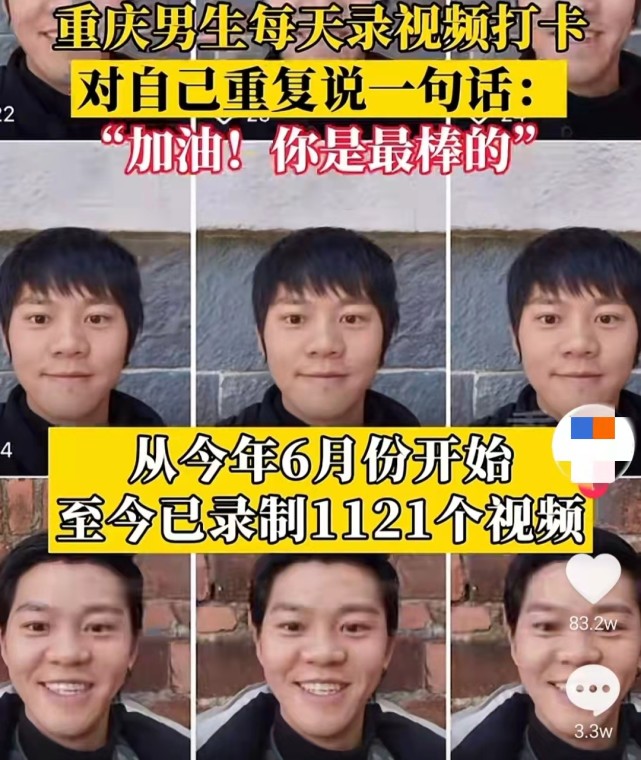 近日,重庆的一位正能量小伙引发网友关注。原因在于他每天坚持录视频打卡,并对自己说“加油!你是做棒的。”2021年6月至今,他的短视频平台已发布了1000多条“加油”打卡视频,平均每天就有三条。12月12日,北青-北京头条记者联系上了这位重庆小伙梅先生,他今年26岁,目前是一名剧组花絮摄像师。