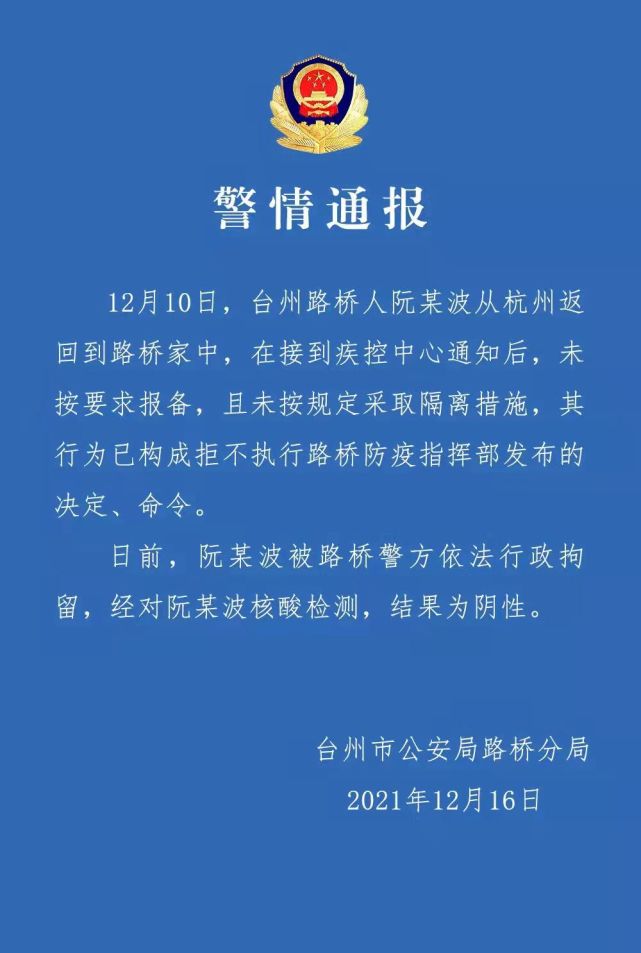 浙江省台州市公安局路桥分局12月16日通报,12月10日,台州路桥人阮某波从杭州返回到路桥家中,在接到疾控中心通知后,未按要求报备,且未按规定采取隔离措施,其行为已构成拒不执行路桥防疫指挥部发布的决定、命令。