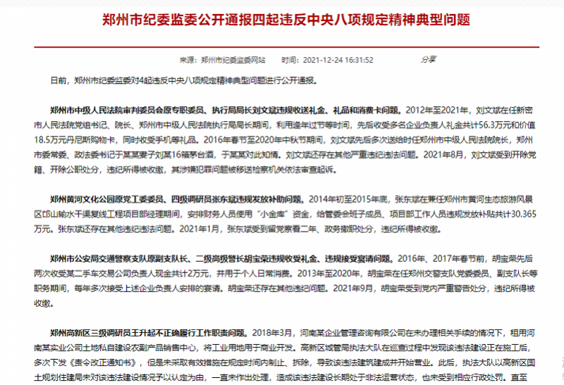 12月26日,南都记者从河南省郑州市纪委监委官网获悉,日前,郑州市纪委监委对4起违反中央八项规定精神典型问题进行公开通报,其中,郑州中院原执行局长刘文斌被曝光多次送给时任郑州市中级人民法院院长,郑州市委常委、政法委书记于某某妻子刘某16箱茅台酒,于某某对此知情。
