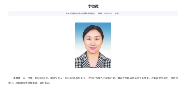 湖南省政协党组书记、主席李微微:1958年3月出生,曾任湖南省委常委、省委政法委书记 ,2016年1月任现职。