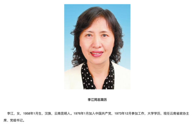 云南省政协主席、党组书记李江:1958年1月生,曾任云南省常务副省长,2017年任省政协副主席、党组书记,2018年任云南省政协主席、党组书记。