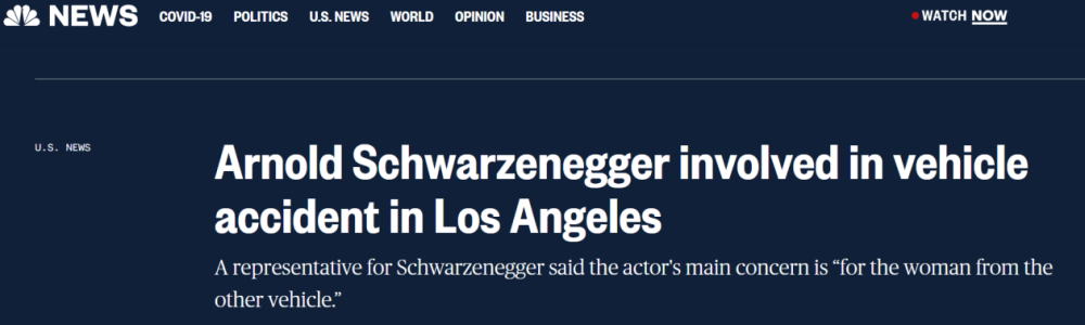 美媒:施瓦辛格洛杉矶发生车祸,事故造成一人受伤