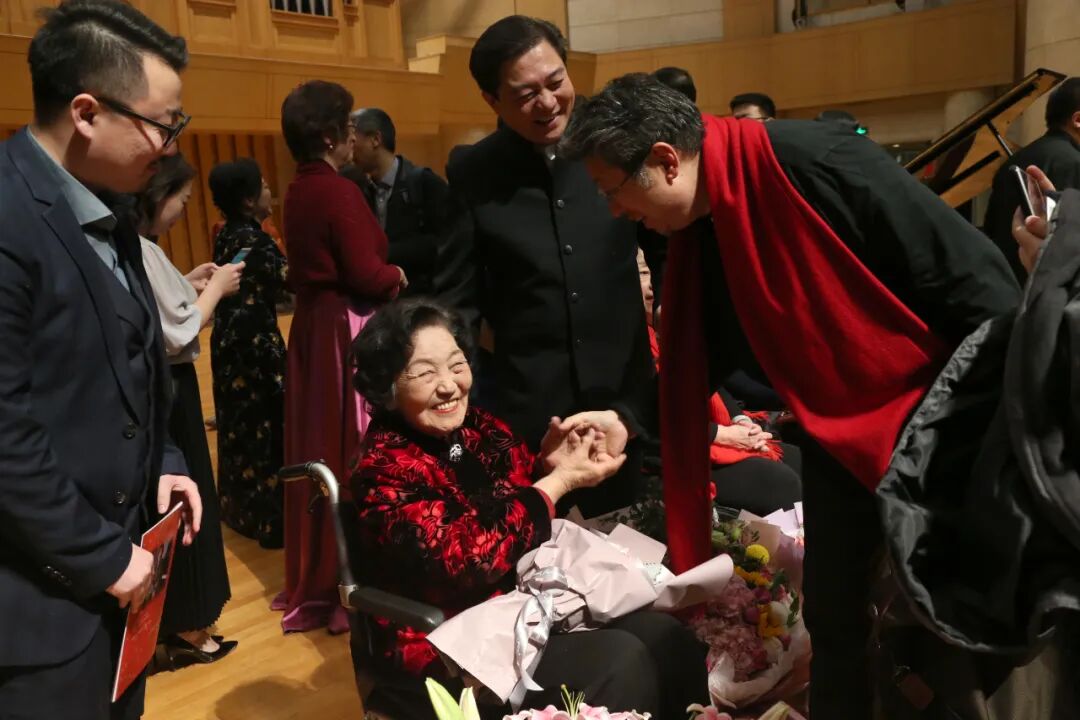 2018年12月17日演出结束,很多周广仁先生的朋友、学生上台向她问好。图中为钢琴教育家刘宁问候周先生