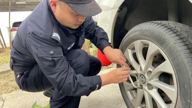 这时高栏港交警大队谢警官和辅警小陈刚结束执勤,回到大队停车场,见到男子站在一辆白色小车旁徘徊,便上前询问情况。男子指着小车右后轮胎,满脸焦灼地说车胎瘪了,但是自己从来没有换过轮胎,此时不知如何是好。