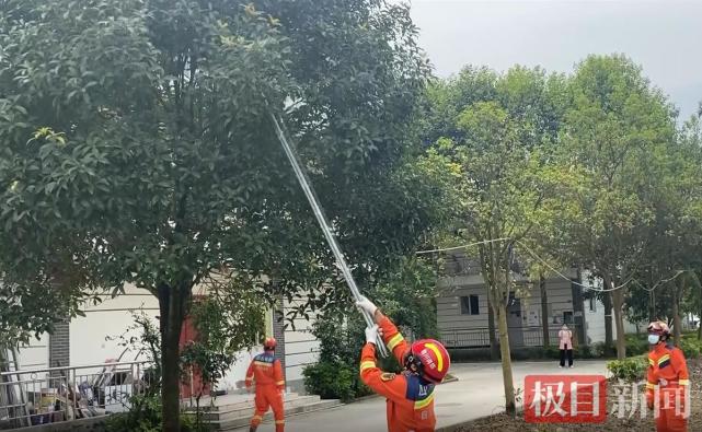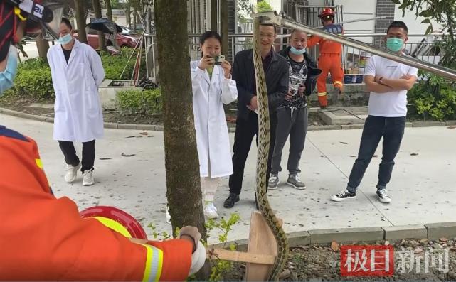 现场视频显示,几名医护人员围着一棵桂花树,称树上有一条蛇。消防人员赶到后,将塑料长杆伸到树冠中搅动,最终蛇被从树上挑下,随即被抓住。