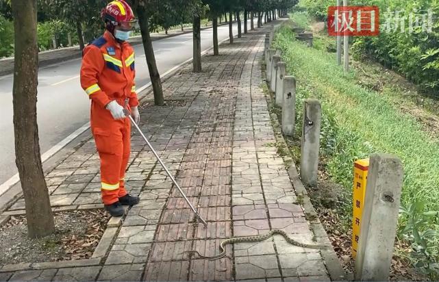 经过辨认,这是一条无毒的菜花蛇,长约1.6米。最终,这条蛇被带到空旷的郊外放生。