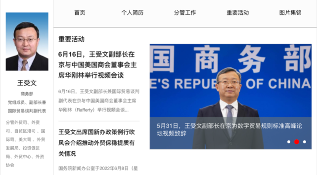 王受文此前为商务部党组成员、副部长兼国际贸易谈判副代表,分管外贸司、外资司、自贸区港司 、国际司、美大司 、外贸发展局、投资促进局、外贸中心、外资协会。