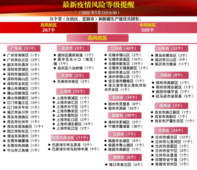 全国中风险区共有509个,分布在广东、内蒙古、北京、天津、辽宁、上海、江苏、安徽、福建、江西、山东、河南、海南、陕西、甘肃,其中上海有196个,江苏64个,安徽61个,广东60个。