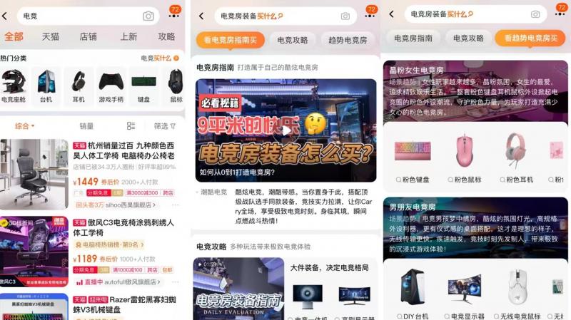 天猫也在过去几年专门为电竞建立了独立的品类标准,比如用户搜索“电竞”,即可查看电竞房指南、电竞攻略、经验分享等内容,以找到最合适自己的商品。