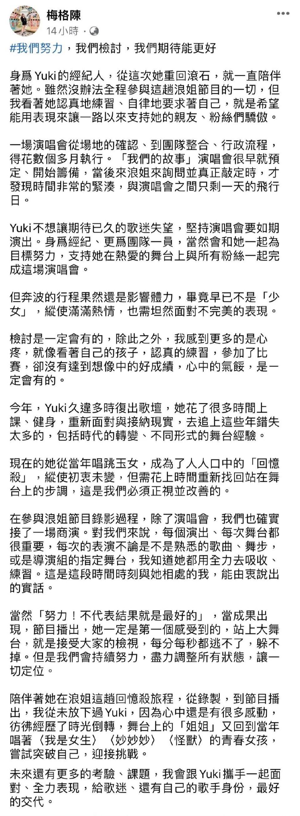 其回应中称早在参加节目前,徐怀钰就已开始筹备演唱会,当后面敲定“浪姐”时才发现时间非常紧凑,“Yuki(徐怀钰)不想让期待已久的歌迷失望,坚持演唱会要如期演出。”