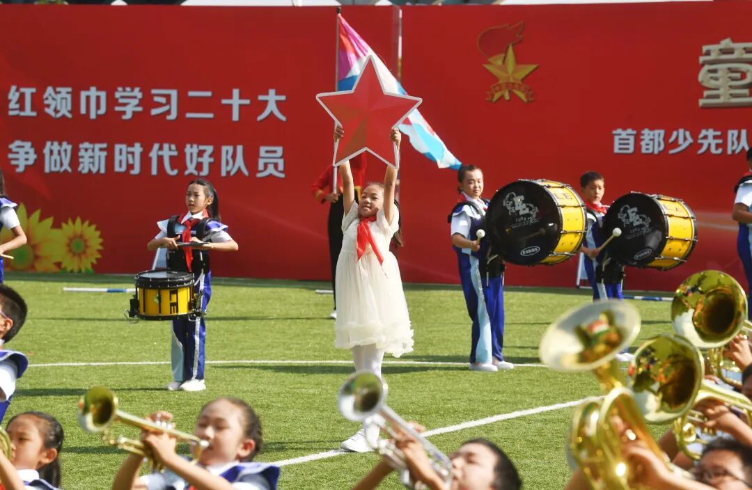 《红星歌》《歌唱祖国》《少年中国说》《歌声与微笑》《让快乐飞翔》《走向复兴》......在一首首熟悉的旋律中,21支少先队鼓号队依次进行展演。