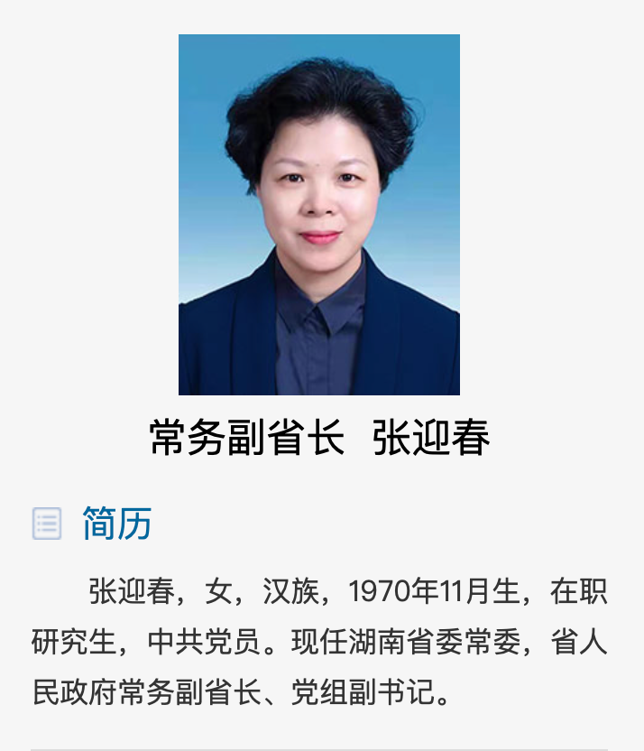 她曾任湘潭市市长、市委书记。湘潭市政府官网当时报道称,她是湘潭史上首位女市长。2021年11月,张迎春任湖南省委常委,去年2月任湖南省副省长。