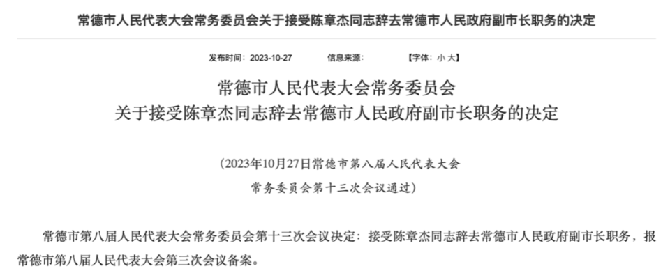 2021年9月,陈章杰升任常德市委常委、秘书长,2022年3月转任市委常委、副市长。