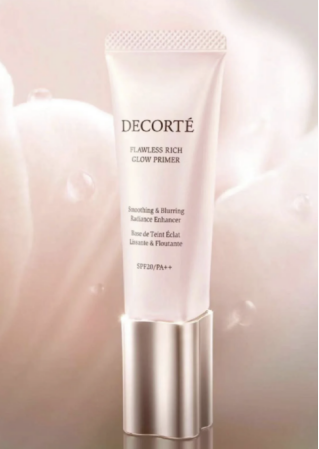 COSME DECORTE的23年秋季新品Flawless Skin Glow Primer SPF20/PA++ 30g ,是一款具有光泽度的妆前打底。上妆后可呈现完美裸肌质感,仿佛整个面部都像抛过光一样。轻轻一抹便像瞬间和整个肌肤融合在了一起,覆盖暗沉、调匀肤色、解决各种肌肤问题,使肌肤变得水润、明亮、红润,打造一种从内部渗透出来的光泽感。除此之外还添加了“银杏叶提取物”和“接骨木花提取物”,可以有效改善暗沉。