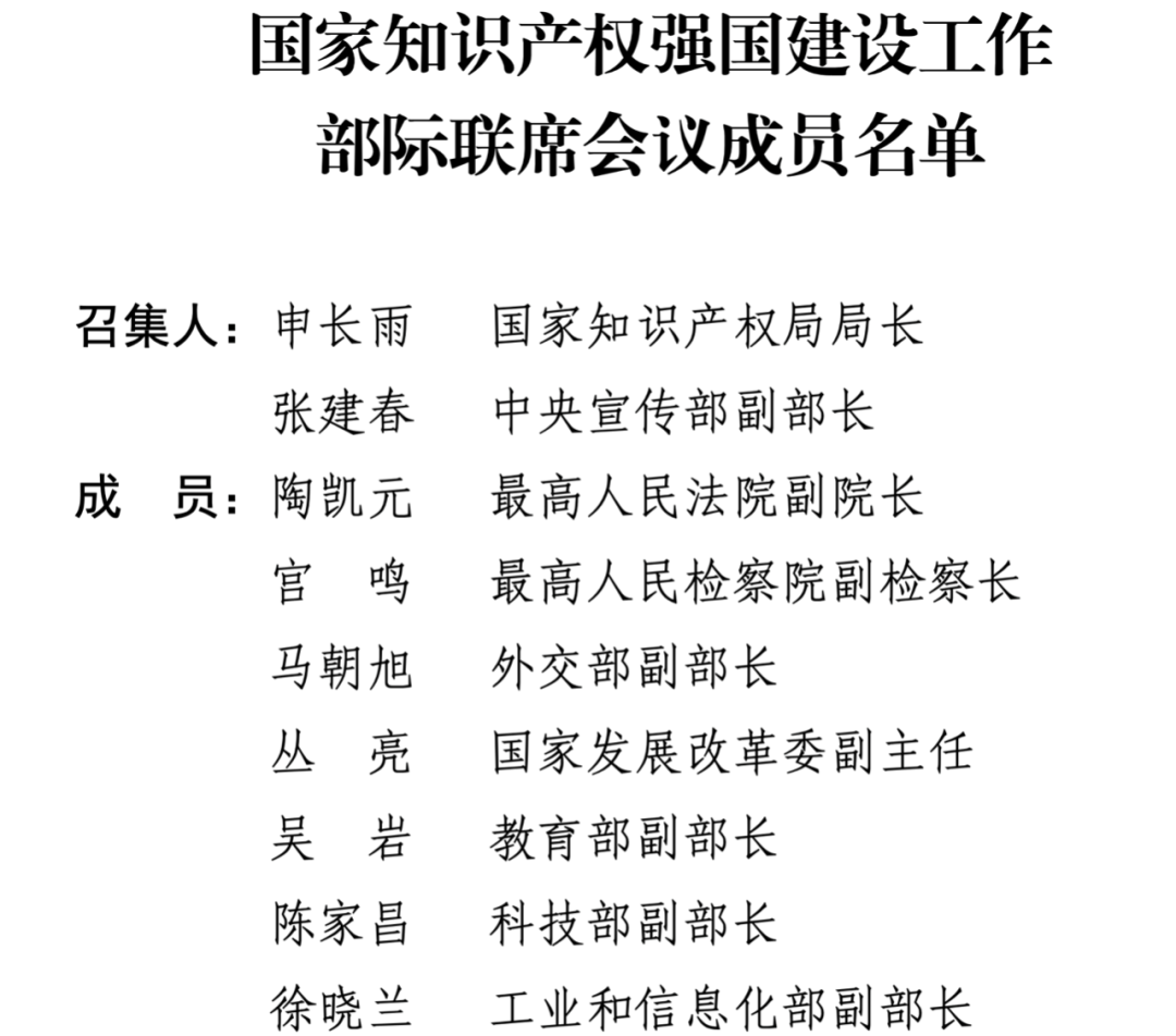 名单显示,国家知识产权强国建设工作部际联席会议的召集人有两位,分别是国家知识产权局局长申长雨、中央宣传部副部长张建春。