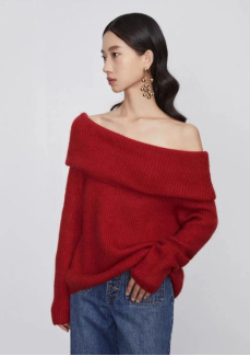 冬日红色穿搭不局限于大面积的外套,选择搭配一件更具氛围感的一字肩红色毛衣,自在慵懒,穿上自带冬日阳光朦胧美。一字肩复古“庞贝红”毛衣,搭配复古蓝直筒牛仔裤,如果想要在新年穿出别致感,就不妨试试这类更具有氛围感的红色毛衣单品,上身不刻意又美得让人无法忽视。