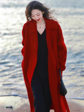红色经典穿搭少不了红黑配色,红色明艳热烈,黑色沉稳内敛,两者相结合碰撞所带来的色彩对比感,给人一种高贵不可方物的感觉。红色羊绒大衣内搭一件黑色v领连衣裙,红黑相撞,大块色彩分割显瘦又高级,v领连衣裙修饰脸型的同时在视觉上削弱了肩宽,达到身形匀称又高挑的效果。