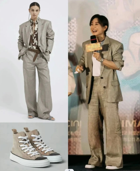 贾玲以简约、舒适、时尚感的穿搭风格赢得了广大粉丝的喜爱。在2月12日北京首映礼,贾玲以一身Brunello Cucinelli2024春夏系列灰金色西装套装亮相,鞋子选择了与服装近似的颜色,整体造型为灰金色搭配白色,干练、大方又清爽。