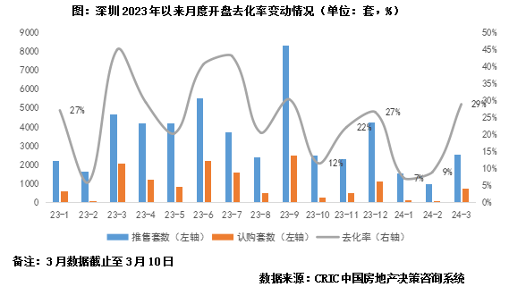 二是从项目开盘来看,平均去化率回升主要还是因基数较低缘故。2024年1-2月开盘去化率仅8%,已跌至2022年以来低位,从3月已经开盘的3个项目来看,去化率基本回升至30%左右,与去年年末基本持平。