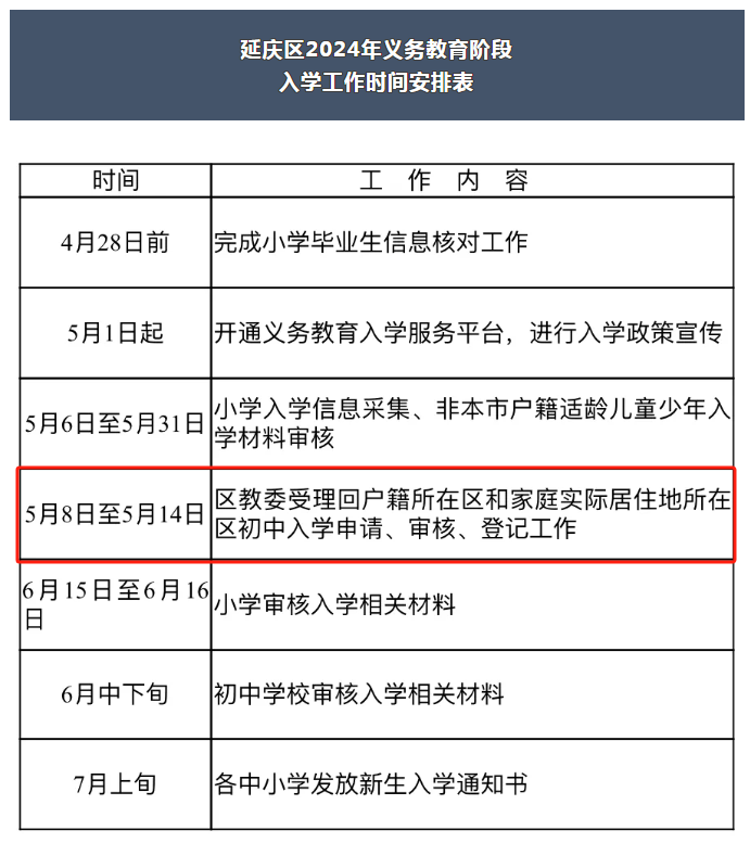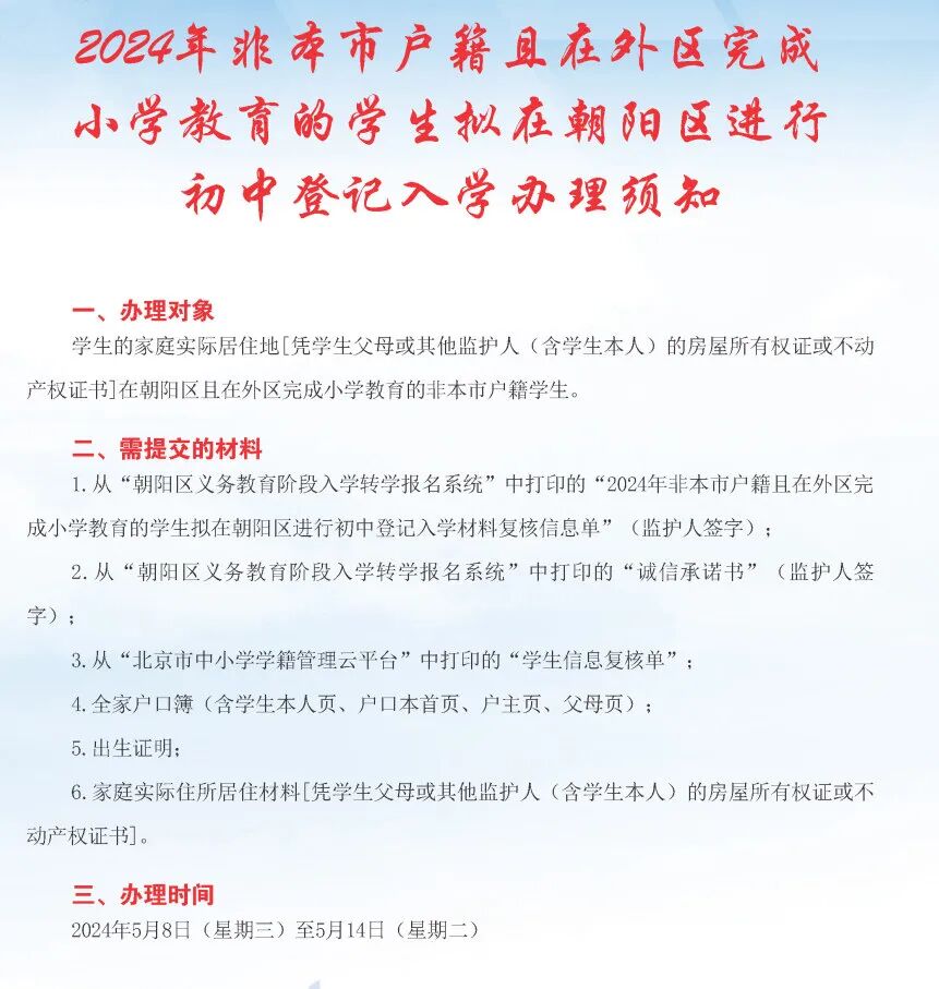 各位家长注意了!5月8日-14日,北京各区教委将受理回户籍或家庭实际居住地所在区初中入学申请、审核、登记。