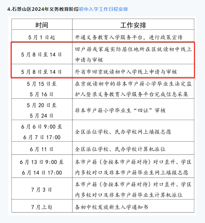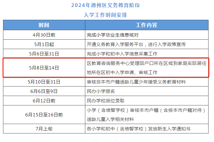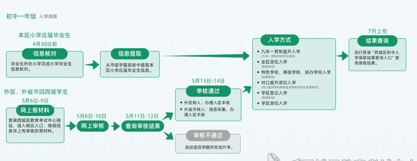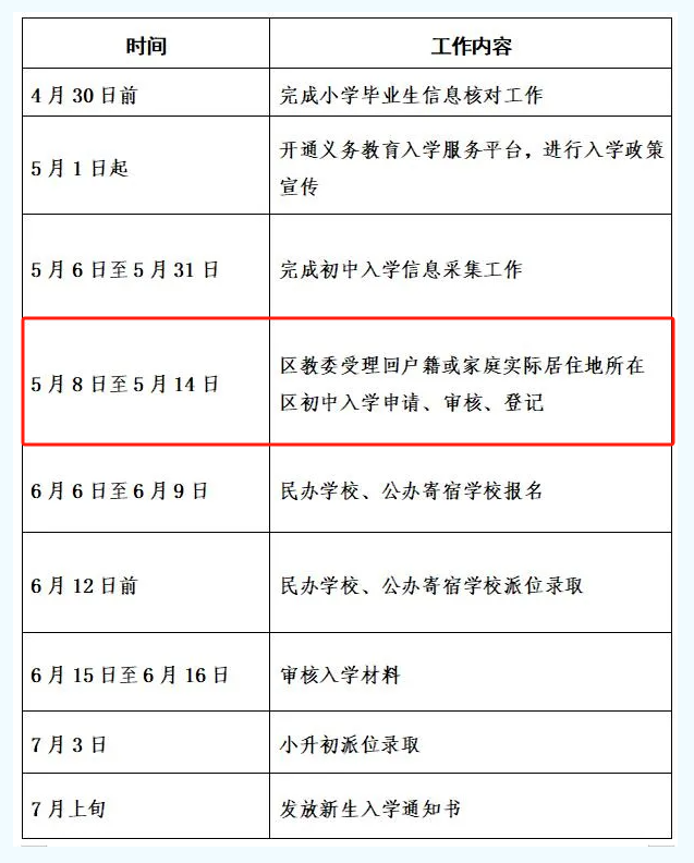 按照市教委的统一安排,5月8日至5月14日各区受理回户籍或家庭实际居住地所在区初中入学的申请、审核、登记工作。学生就读小学需为学生从初中入学服务系统中提交申请,转出区审核通过后,家长可到入学区办理相关手续。请注意办理时间,错过将影响入学。