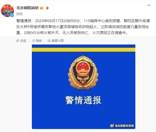 6月17日,北京市朝阳区消防救援支队发布通报,6月17日20时00分,119指挥中心接到报警,朝阳区朝外街道东大桥9号楼侨福芳草地大厦顶层储物间杂物起火,立即调派消防救援力量到场处置,20时45分明火被扑灭,无人员被困伤亡,火灾原因正在调查中。